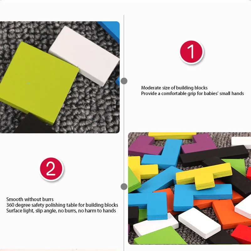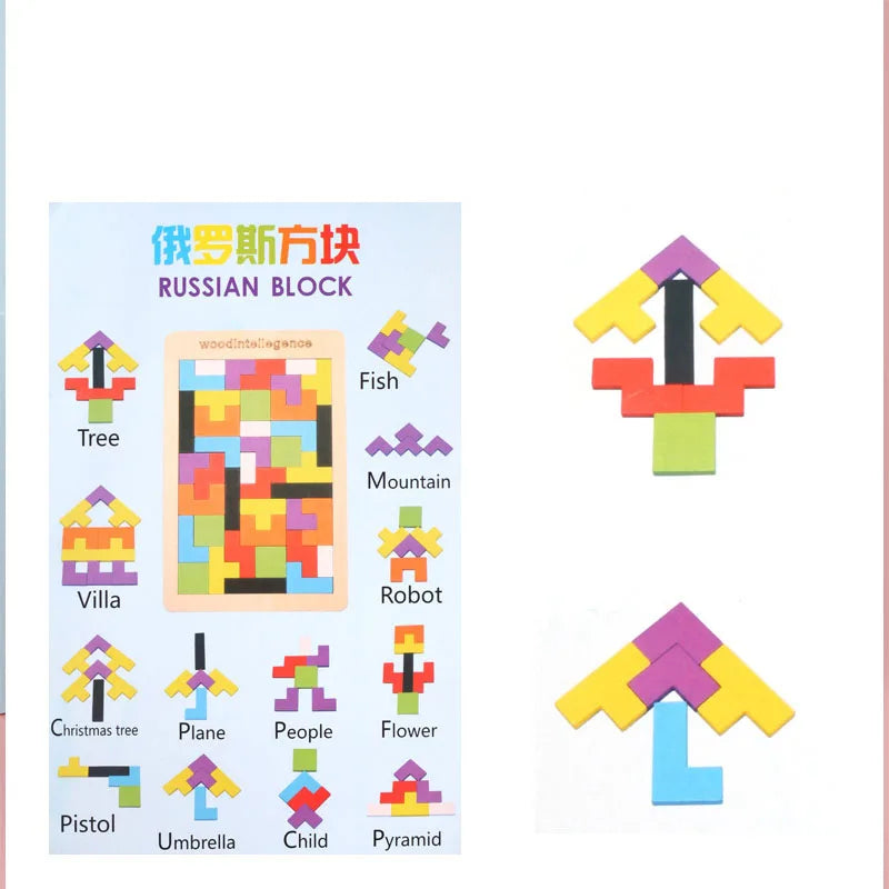 * El juego de rompecabezas de juguetes de madera tiene varios ejemplos de formas y cosas que hacer con él, cada vez que mezclas las piezas el rompecabezas saldrá de manera diferente.como pistola, ser humano, robot, árbol, paraguas, flor, pirámide, avión, etc.